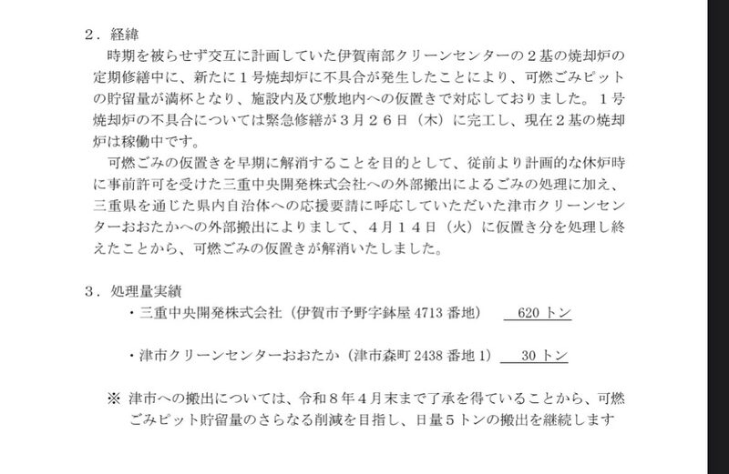 伊賀南部クリーンセンターで発生していた可燃ごみの仮置きについて、解消されたとの報告がありました。