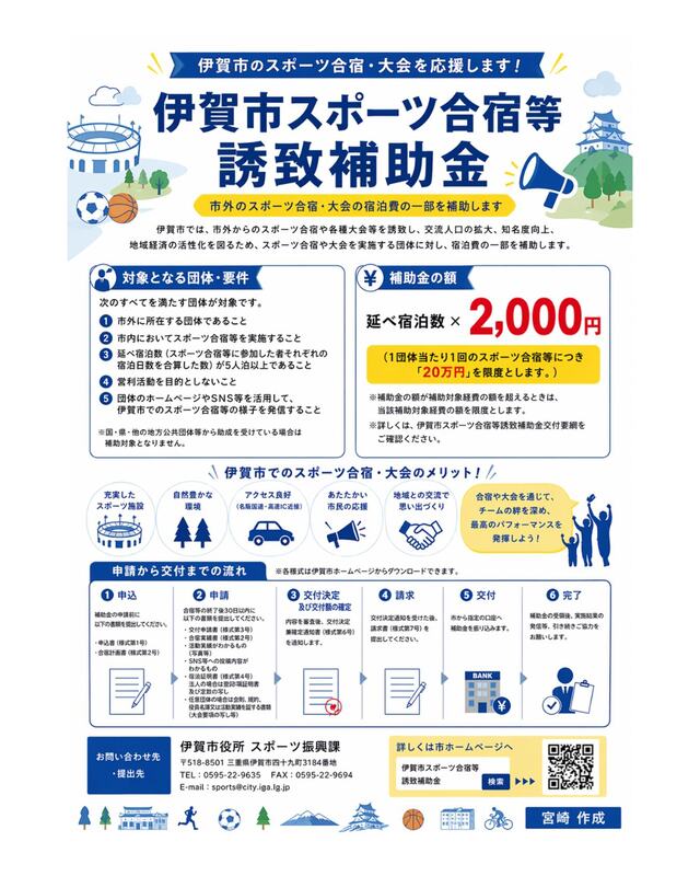 伊賀市では、市外からのスポーツ合宿や大会の開催に対し、宿泊費の一部を補助しています。