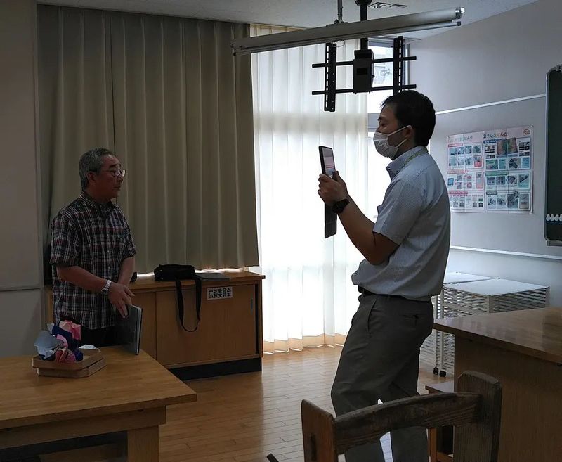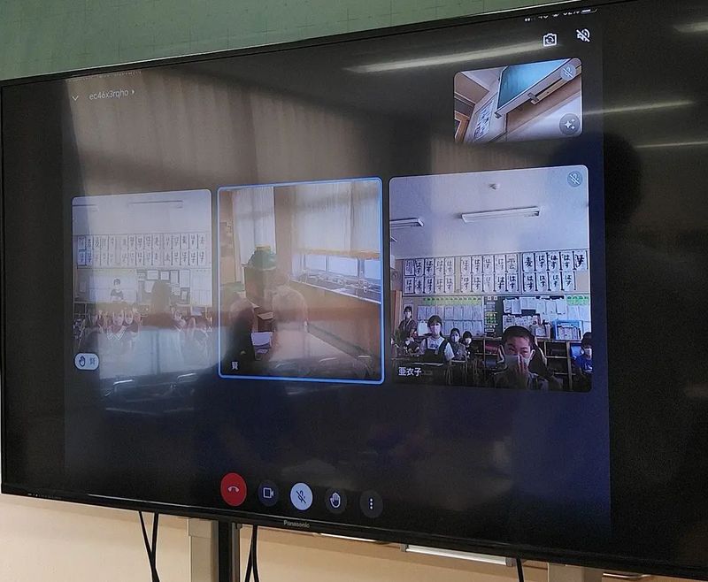 本来なら、神楽のお面を着けてもらったり、道具を直接触ってもらうような体験をするところですが、今日まで緊急事態措置なので、私たちも図工室と教室を結んだリモート授業となりました。