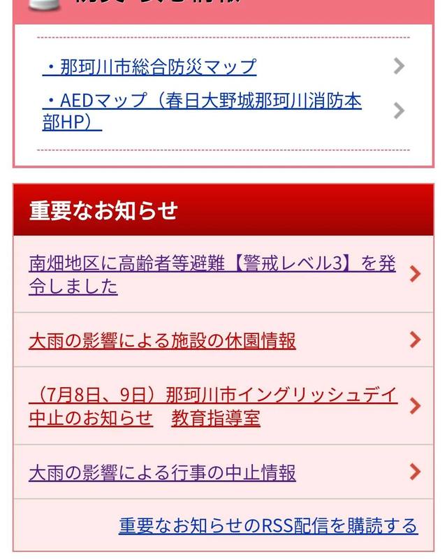 大雨による避難情報や、公共施設の休園、イベントの中心情報などが出されています。