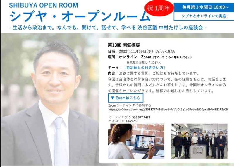 ホーム>政党・政治家>中村 たけし (ナカムラ タケシ)>本日、毎月第三水曜日はシブヤ・オープンルーム。
