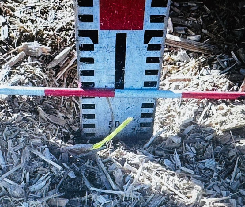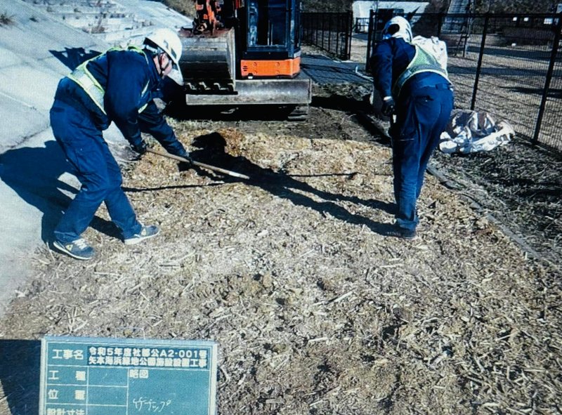 県海浜緑地公園に約5センチの竹チップを敷設し、今後、効果を検証していきます。