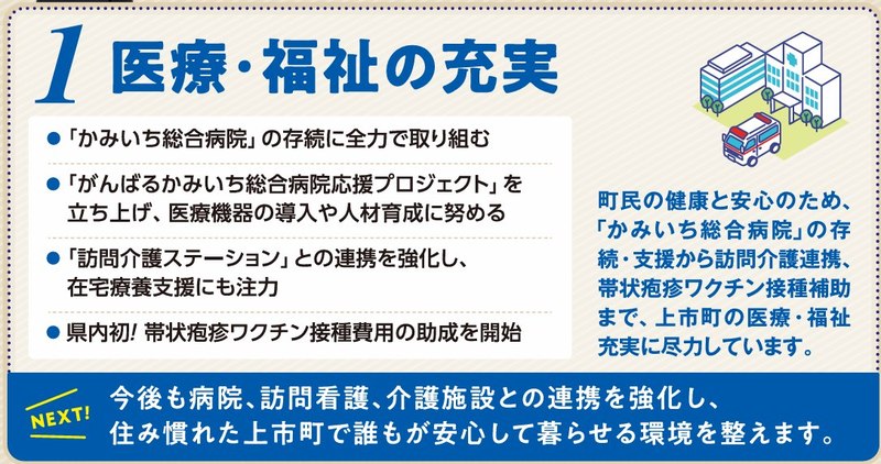 これからも、町民のみなさまとかみいち総合病院を守り、住み慣れた家で安心して医療を受けられる仕組みを構築してまいります。