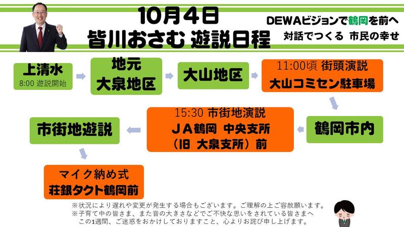 ホーム>政党・政治家>皆川 おさむ (ミナカワ オサム)>10月4日(土)最後の遊説日程です🍀🎤15:30-@モントアール白山店個人演説会19:20-@...