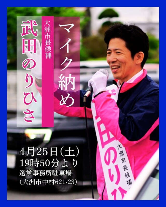 お知らせ🙋 4月25日(土)19時50分より。 選挙事務所駐車場にて マイク納めを行います🎤