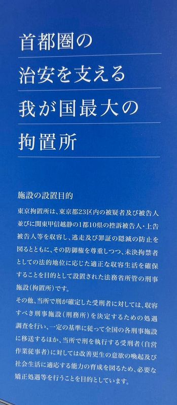「東京都23区内の被疑者及び被告人並びに関東甲信越静の1都10県の控訴被告人・上告被告人等を収容し、逃走及び罪証隠滅の防止を図るとともに、 その防御権を尊重しつつ、未決拘禁者としての法的地位に応じた適正な収容生活を確保することを目的として設置された法務省所管の刑事施設 (拘置所) です。
