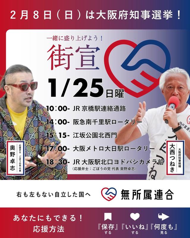 大阪府知事候補・大西つねきのこの後の街頭演説会の予定です。ぜひ現地で生の声をお聞きください。(事務局)