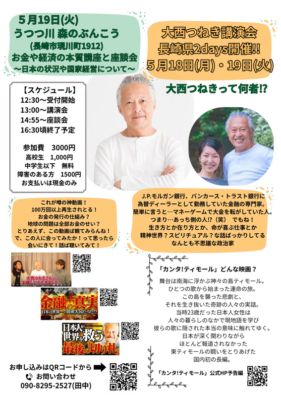 ホーム>政党・政治家>大西 つねき (オオニシ ツネキ)>5月15日からは九州ツアーです📣5月18日(月)と19日(火)に長崎県でお話会を開催することに...