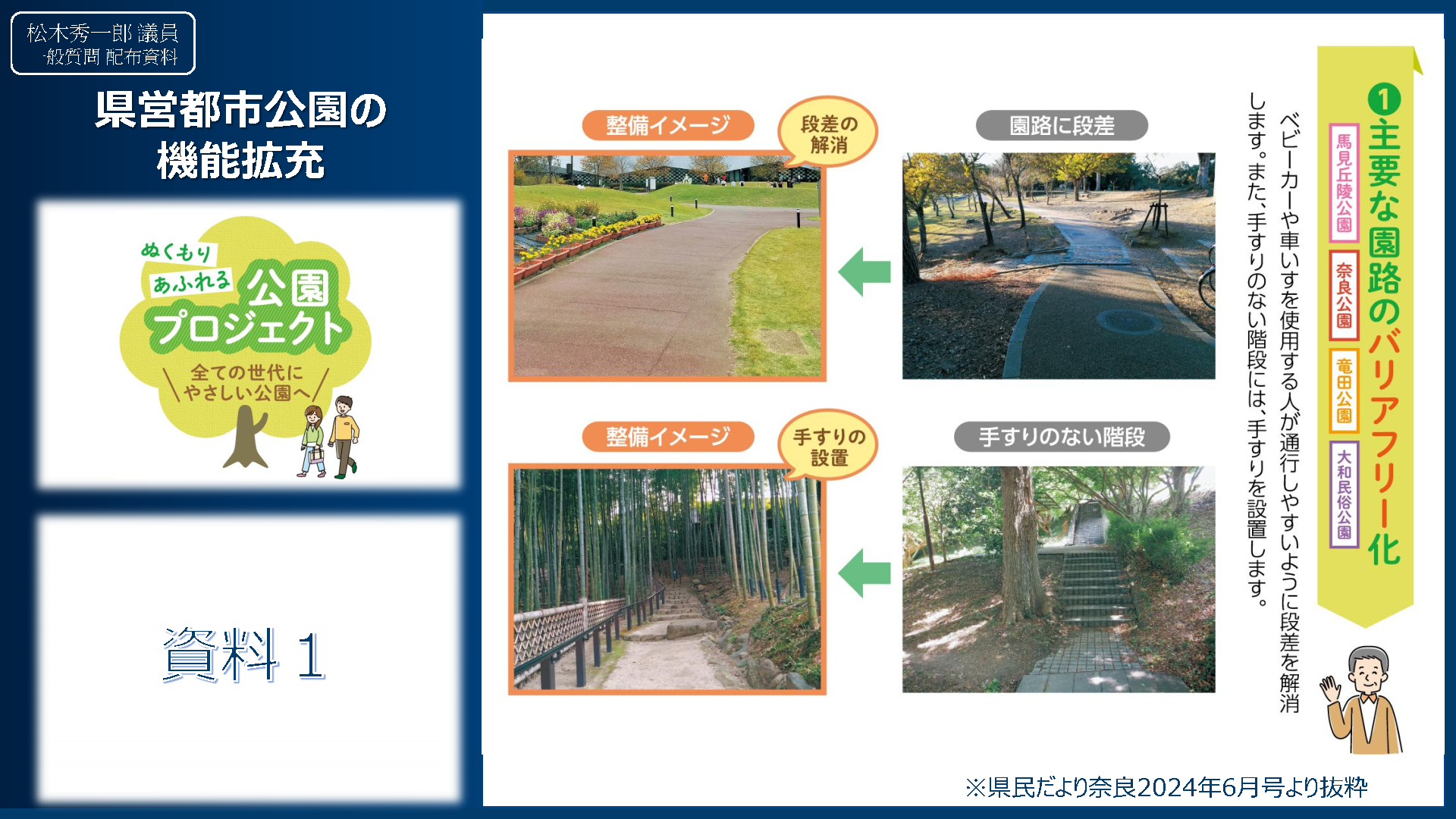 モニター投影資料1ですが、県では、「ぬくもりあふれる公園プロジェクト」として、こども・子育て世代をはじめとした全ての世代にやさしい公園機能の拡充を加速させています。