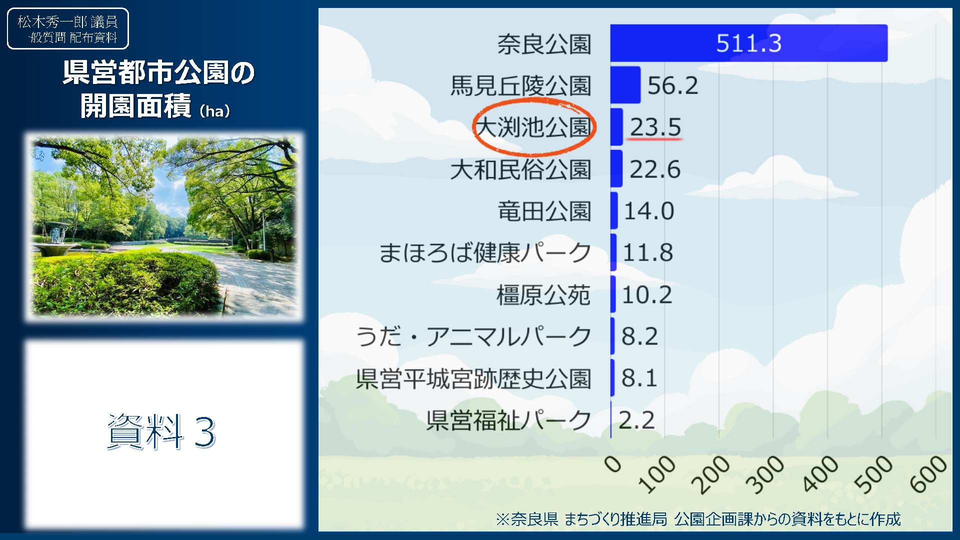 例えば大渕池公園は、奈良公園と馬見丘陵公園に次いで大きな面積を擁しており、近隣地域の人口も多く、大きな可能性を秘めていると思います。