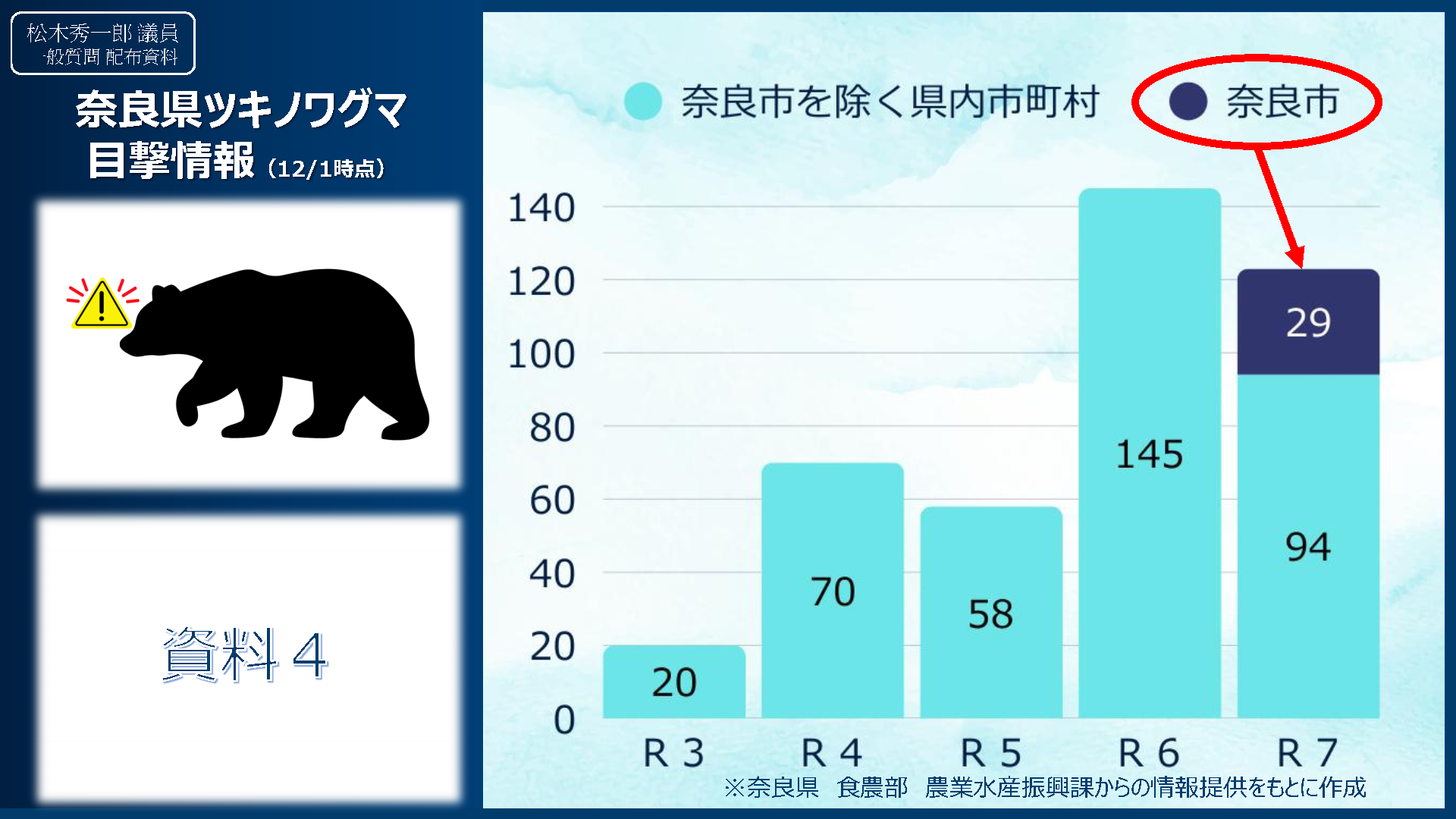 投影資料4は、過去5年のクマと思われる目撃情報の件数推移ですが、