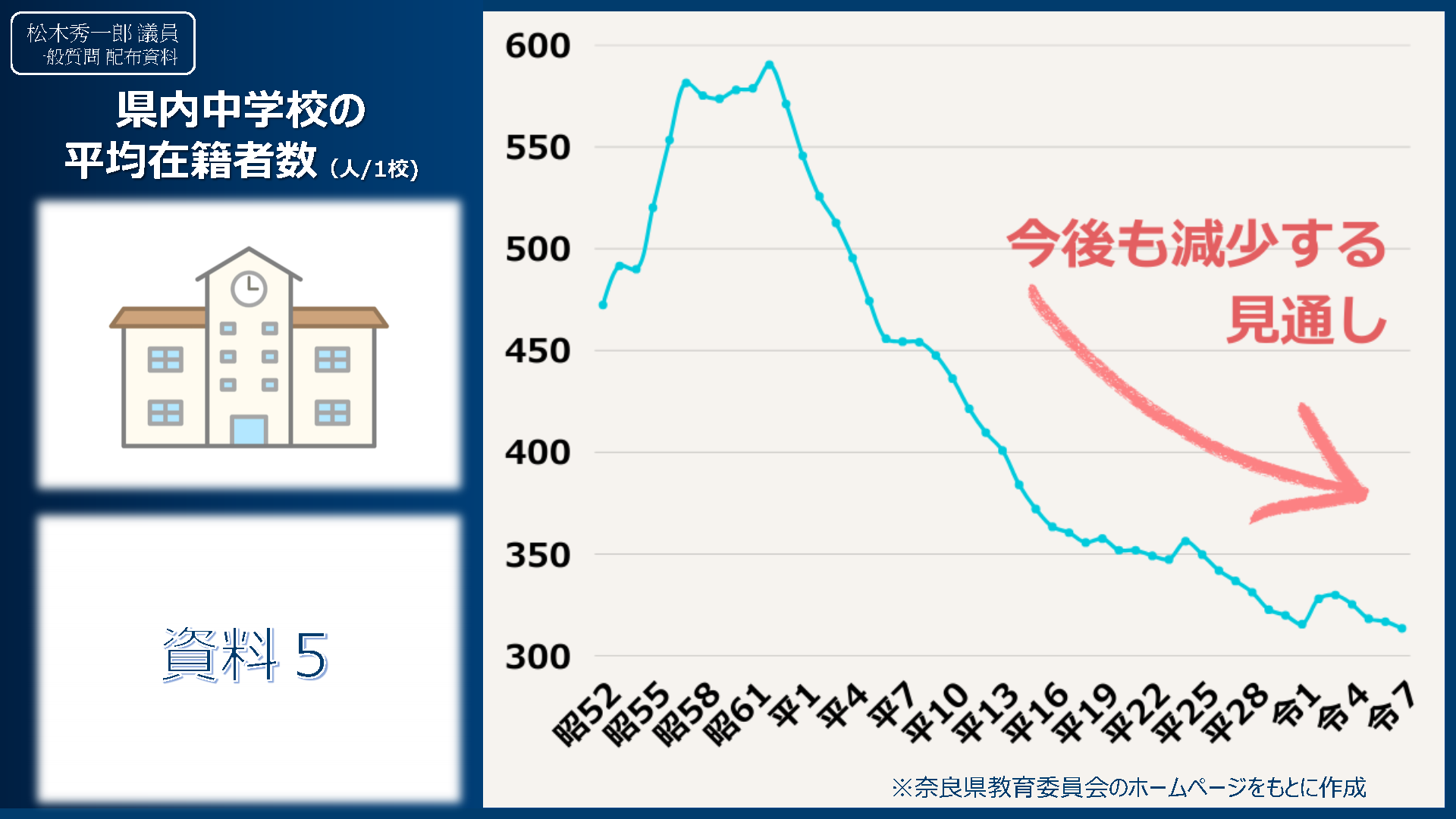 投影資料5は、県内中学校1校あたりの平均在籍者数です。