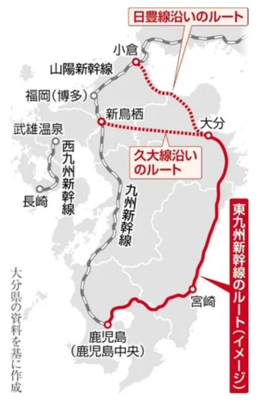 福岡市と鹿児島市を結ぶ東九州新幹線の計画を巡り、県は31日、日田市の県西部総合庁舎で同市や玖珠、九重両町の住民らを対象に整備効果や課題などの説明会を開いた。福岡―大分市間について県が昨年11月に公表したJR日豊、久大両線沿いの2ルート案の調査結果が示され、参加者からは日田市などを通る久大線ルートでの整備を期待する声などが上がった。(関屋洋平) 【地図】東九州新幹線のルート