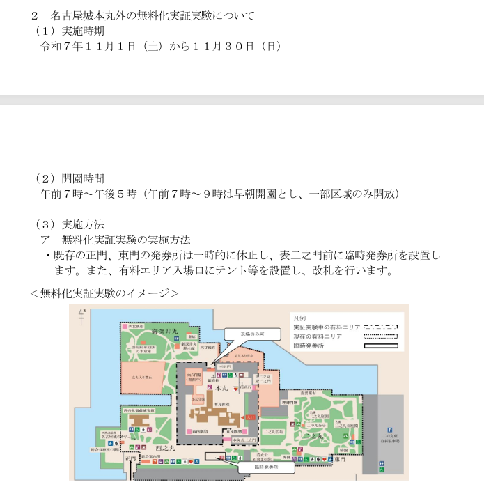 無料化の対象となるのは「本丸外」の区域で、これまで有料だったエリアの一部が自由に散策できるようになります。正門・東門の発券所は一時的に休止し、表二之門前に臨時の発券所を設置。有料エリアとの境界にはテント等による改札を設ける形で運用されます。