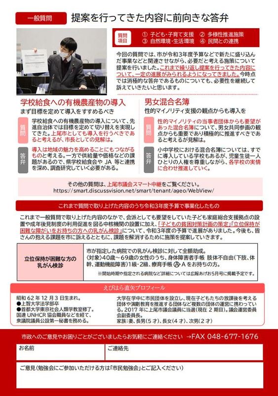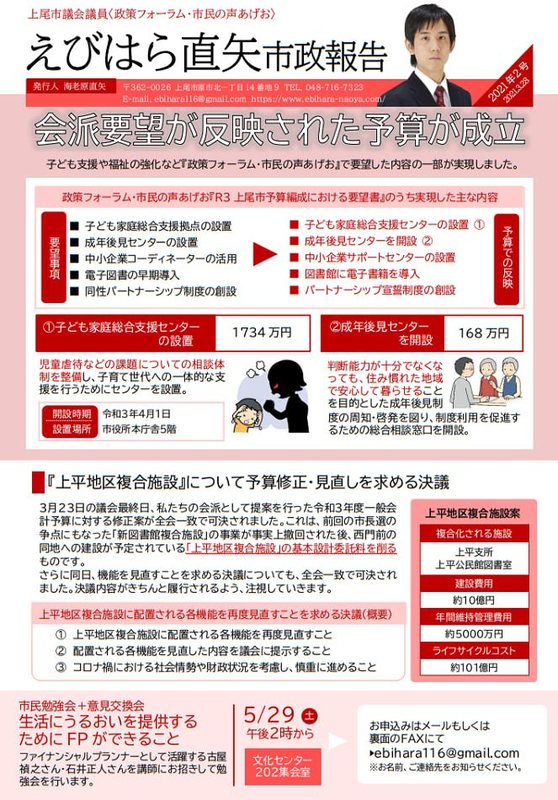 ホーム>政党・政治家>えびはら 直矢 (エビハラ ナオヤ)>【市政報告2021年第2号】3月定例会が閉会したことを受けて、市政報告を作成しました。