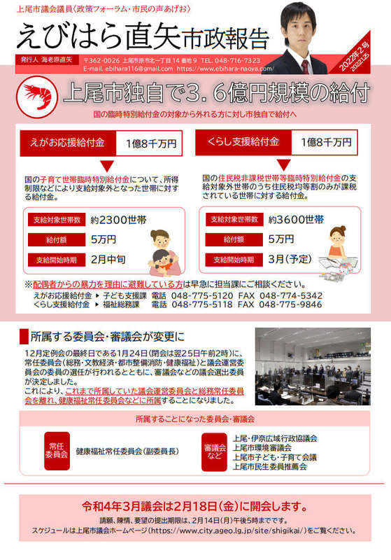ホーム>政党・政治家>えびはら 直矢 (エビハラ ナオヤ)>【市政報告令和4年第2号】今年2号目となる市政報告を作成しました。