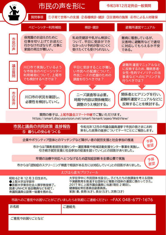 今年2号目となる市政報告を作成しました。今回は、上尾市が独自に行う3.6億円規模の給付金事業と一般質問の内容についてまとめています。