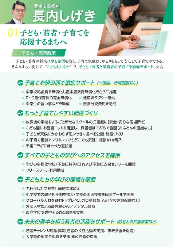 ホーム>政党・政治家>長内 しげき (オサナイ シゲキ)>長内しげき5つのビジョン①子ども・教育政策・子育てを経済面で徹底サポート・もっと子育てしやすい...