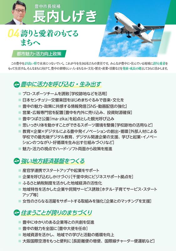 ホーム>政党・政治家>長内 しげき (オサナイ シゲキ)>長内しげき5つのビジョン④都市魅力・活力向上政策・豊中に活力を呼び込む・生み出す・強い地方経済...