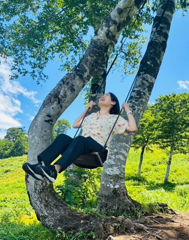 高台の高木にブランコを取り付け、