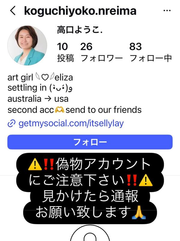 ホーム>政党・政治家>高口 ようこ (コウグチ ヨウコ)>⚠️偽物アカウントにご注意ください⚠️見かけたら通報お願い致します。