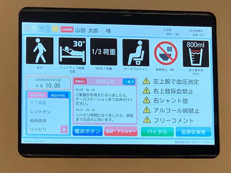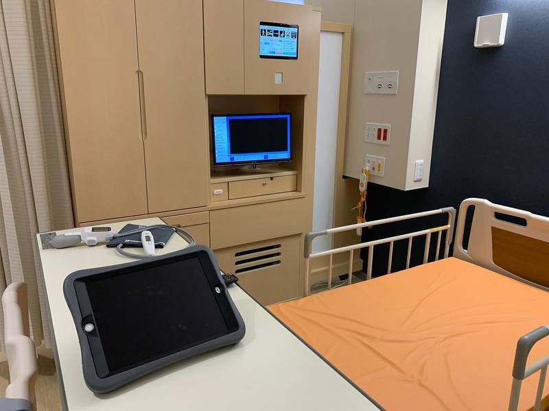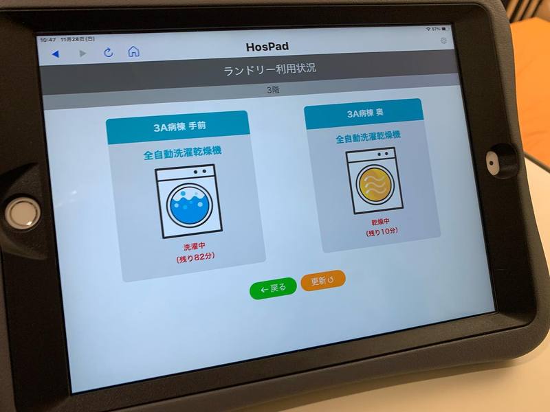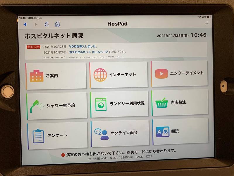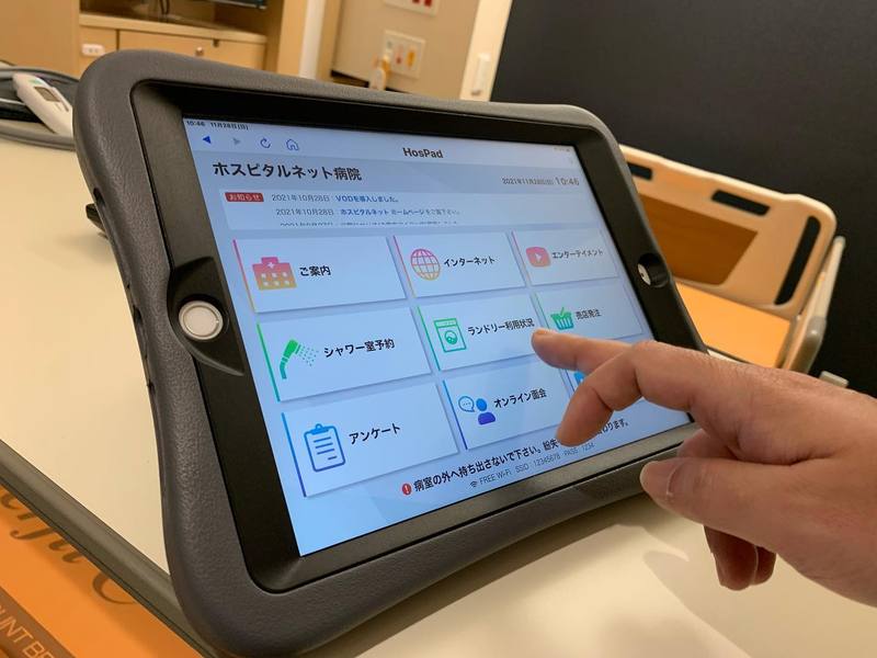 「HosPad」というアプリで、ネット、映像アプリ、シャワー室やランドリー室の予約、売店注文、オンライン面会もできるもの。