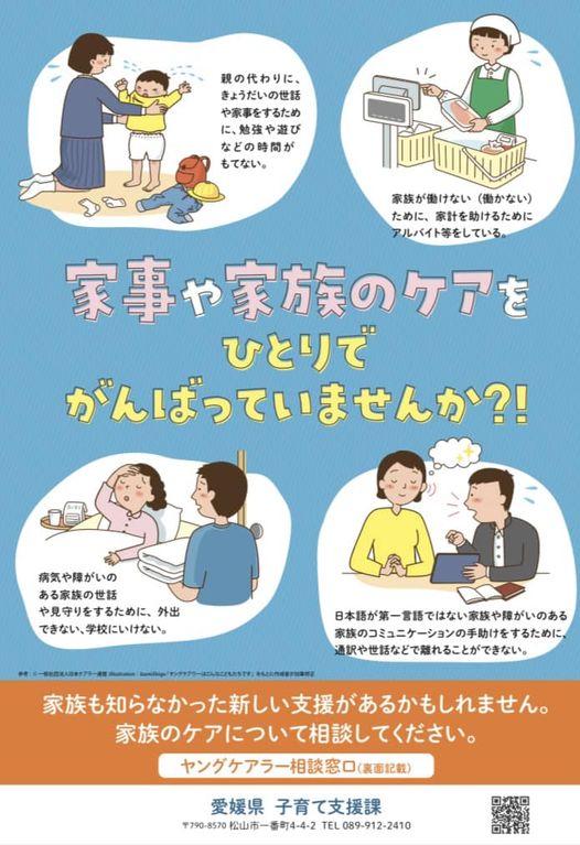 「ヤングケアラー」とは、家族の介護・その他の日常生活上の世話を過度に行なっていると認められる子ども・若者であり、本来受けるべき教育が受けられない・同世代との人間関係を満足に構築出来ない等々の困難に直面している方達です。昨年度の実態調査では、愛媛県下において自身が「ヤングケアラー」との認識がある中高生が約200名であり、8割の方が相談経験がありません。その多くが傾聴の機会を始めとした支援を求めています。家庭にはそれぞれの価値観があり、一方的な介入は望ましくないですが、相談できる場所がある事は広く伝えていく必要があります。本年、子ども・若者育成支援推進法が改正され、ヤングケアラーが支援対象として明記され、国・自治体が連携をし早期発見につとめていますが顕在化しにくい事も多々あります。自身の境遇に思い悩む子どもたちが、苦しいと言える社会でなければなりません。