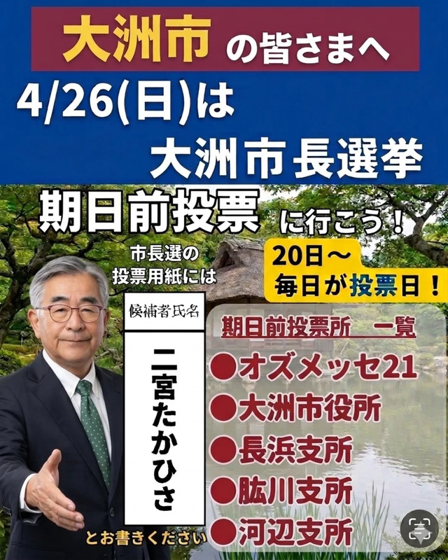 #大洲市長選挙#二宮たかひさ#二宮隆久#期日前投票#大洲市長候補