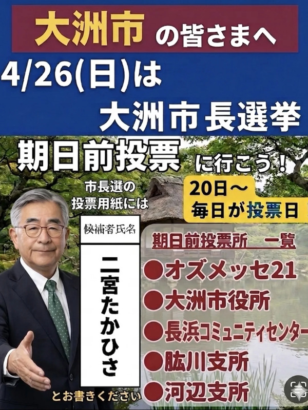 #大洲市長選挙#二宮たかひさ#二宮隆久#期日前投票#大洲市長候補