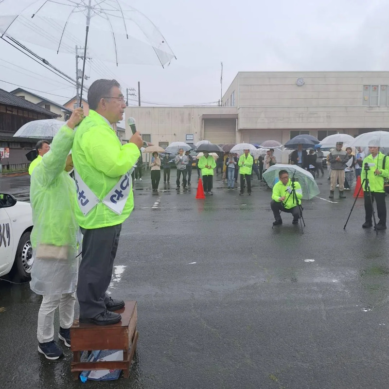 降りしきる雨の中、傘をさしたたくさんの方々にお迎えをいただき、しっかりお話を聞いていただきまして本当にありがとうございました。心から感謝感激いたしました。同行しておりました三女も、皆様の激励に感極まっておりました。応援演説いただいた村上松平市議会議員様、ありがとうございました。