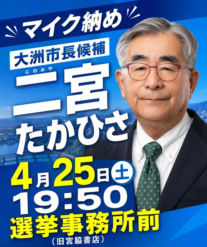 明日、19時50分頃より、二宮たかひさ選挙事務所(旧宮脇書店)前にて、最後の演説「マイク納め」を行います。是非、お集まりいただきますようお願い申し上げます!