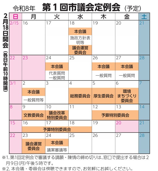 初日は議案審議に加え、市長の施政方針表明、そしてそれに対する代表質問が行われる予定です。