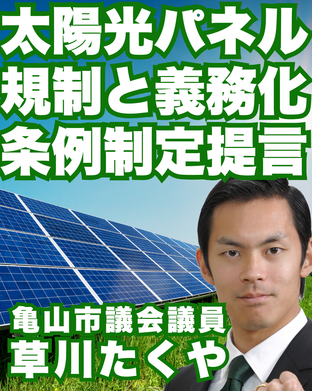 ホーム>政党・政治家>草川 たくや (クサカワ タクヤ)>【草川たくや 亀山市】太陽光発電とまちづくり。暮らしと自然を守るため、今こそ実効性のある条例制定を