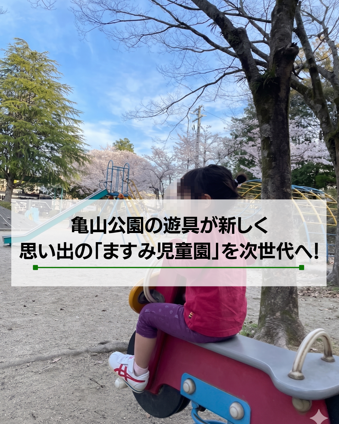 亀山市民の皆様にとって、亀山公園は「子どもの頃に遊んだ」「親になって子どもを連れて行った」という、たくさんの思い出が詰まった大切な場所ではないでしょうか。特に「ますみ児童園」のあのユニークな遊具は、まさに亀山のシンボルです。
