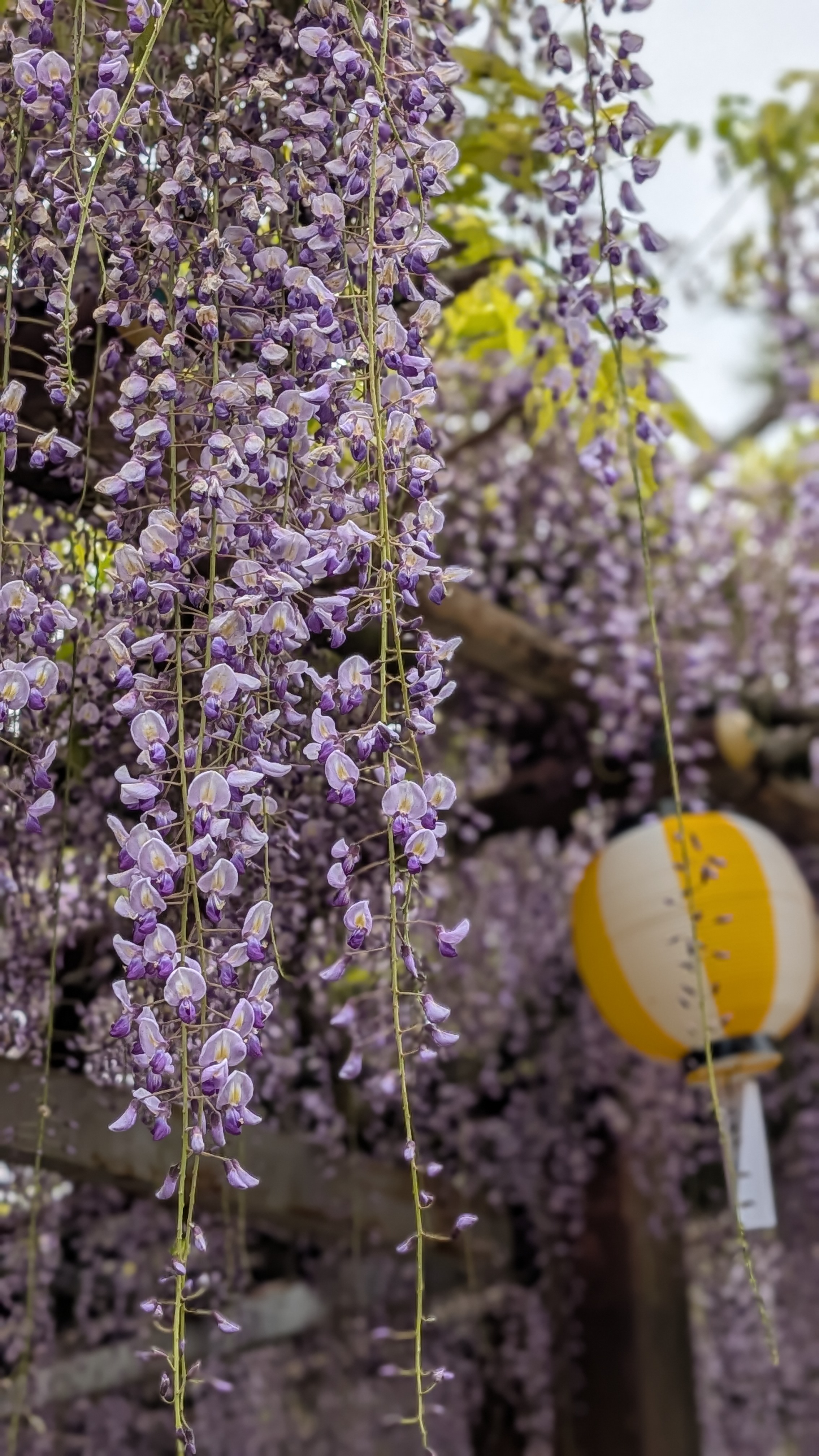 藤棚は、ぐるりと見渡して18メートル四方ほど。その下に立つと、頭上から美しい花房が無数に垂れ下がってきます。風が吹くたびに、ふわっと甘い香りが流れてきて、紫のシャンデリアがゆっくり揺れている——本当に、そんな光景でした。