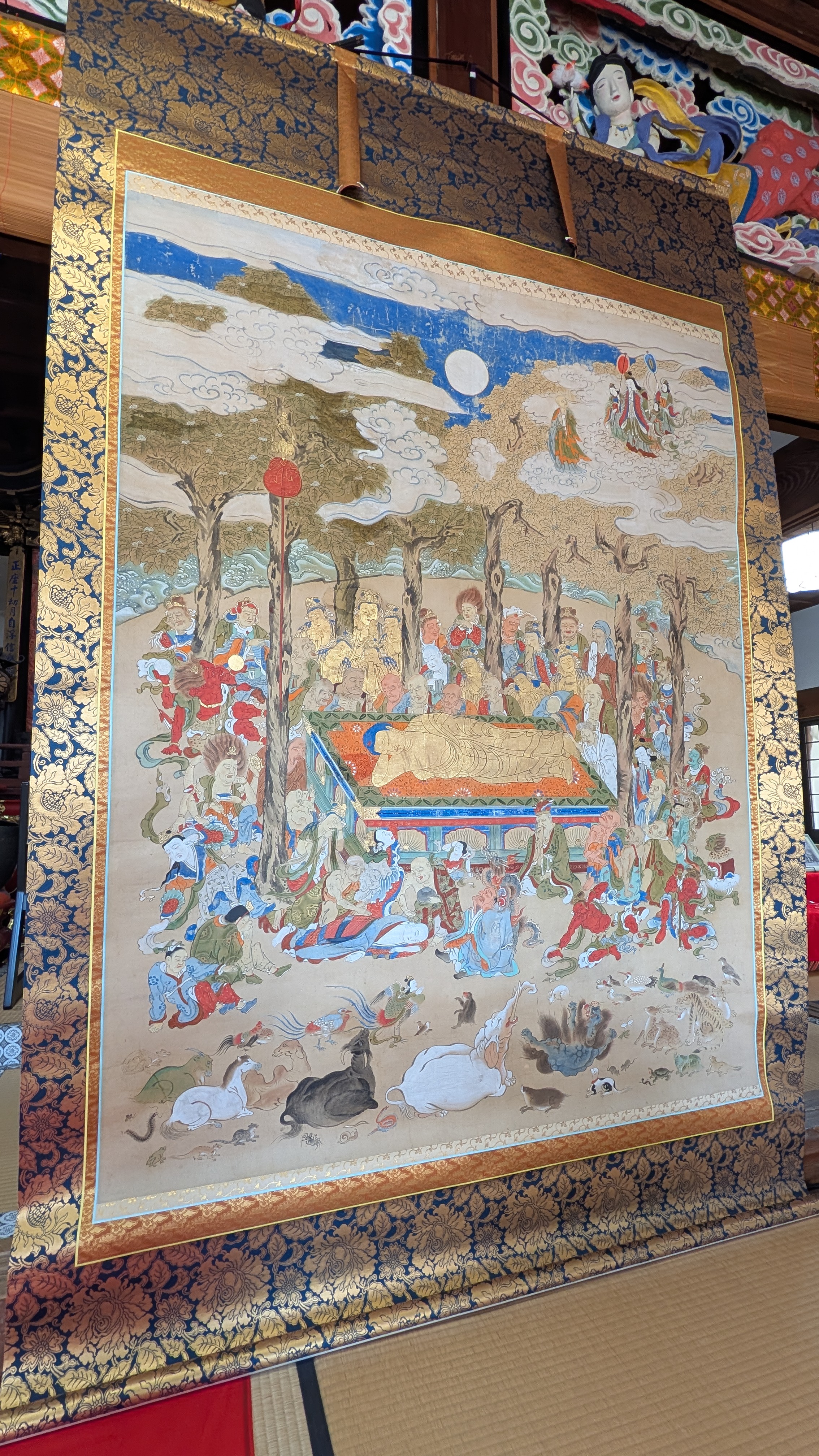 藤まつりは5月3日まで開催中。境内では、涅槃図(ねはんず/お釈迦様の絵)の公開や絵解き、寺ヨガ、写経、落語の「みたらし寄席」、亀山ブランドの販売、そして地元のコスモスさんによる手作りパンや野菜の販売など、たくさんの催しが行われます。お寺と観光協会と地域の皆さんが力を合わせて、この時期のにぎわいを作っているのが伝わってきます。