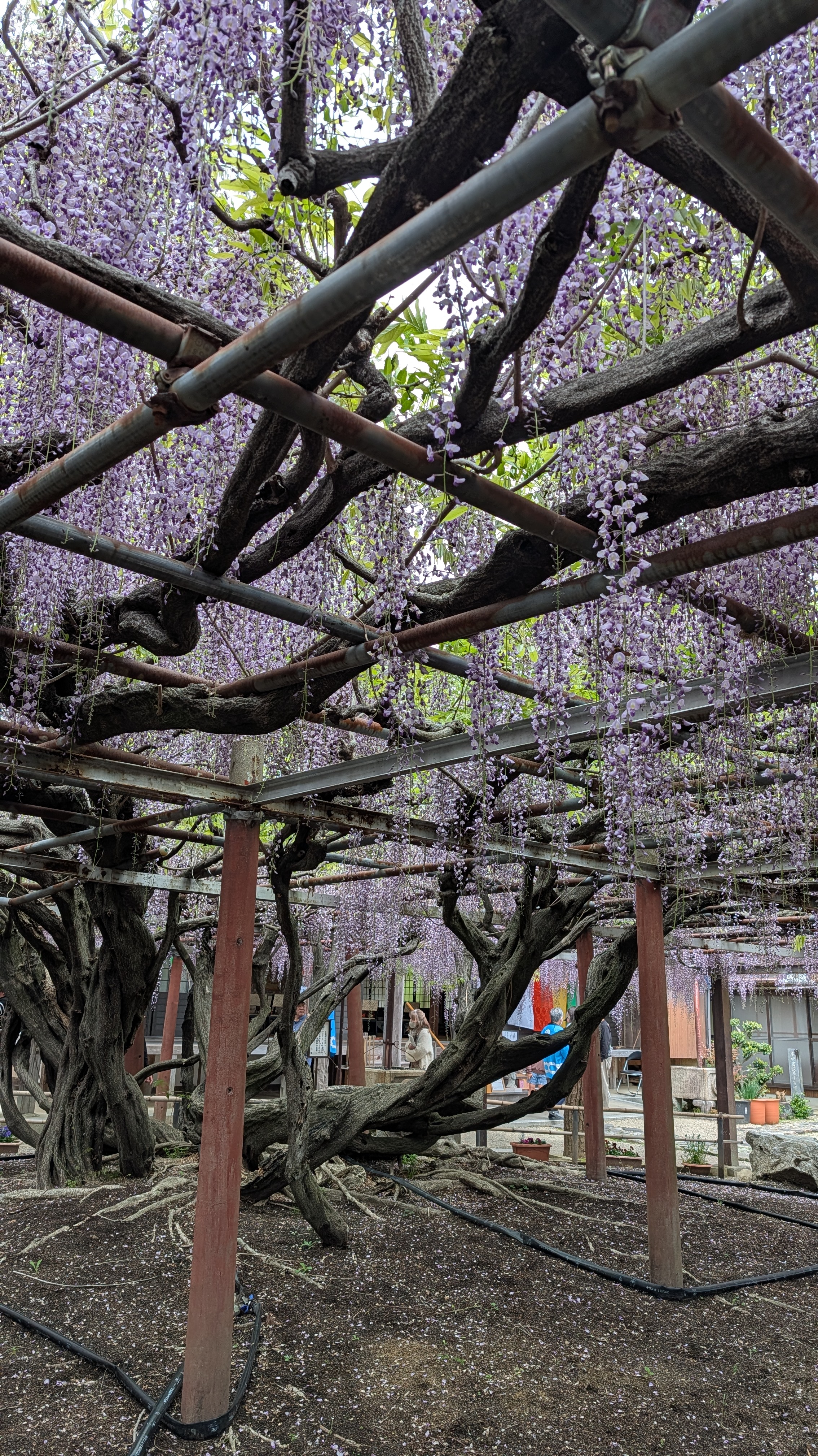 夏と冬の年2回の剪定、肥料、虫やこぶ病への対策、土の入れ替え、鉄骨でできた藤棚そのものの維持——。これらを、住職さんと檀家の有志の方々が支えてくださっているのだそうです。入場時にいただく「藤保存協力金」は大人200円・中学生以下は無料。この200円が、樹齢150年の藤を未来につなぐ大切な一歩になっています。