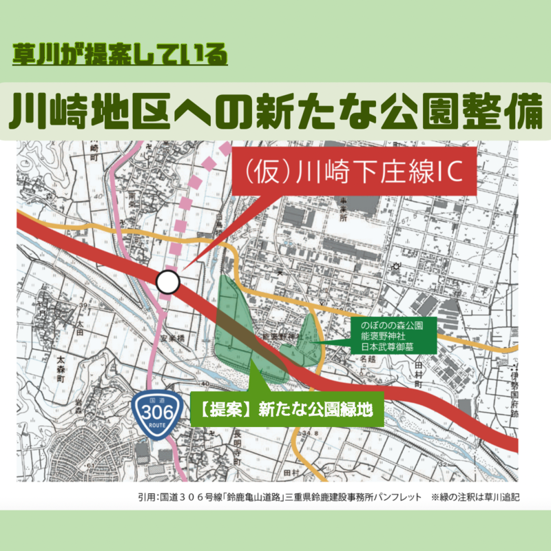 とはいえ、公園の整備と維持管理には大きな予算を必要とします。そこで私が注目したのは鈴鹿亀山道路の川崎下庄線ICのポテンシャルです。鈴鹿亀山道路の川崎下庄線IC周辺の整備計画と公園整備を一緒にやってしまおうというのが私からの提案です。