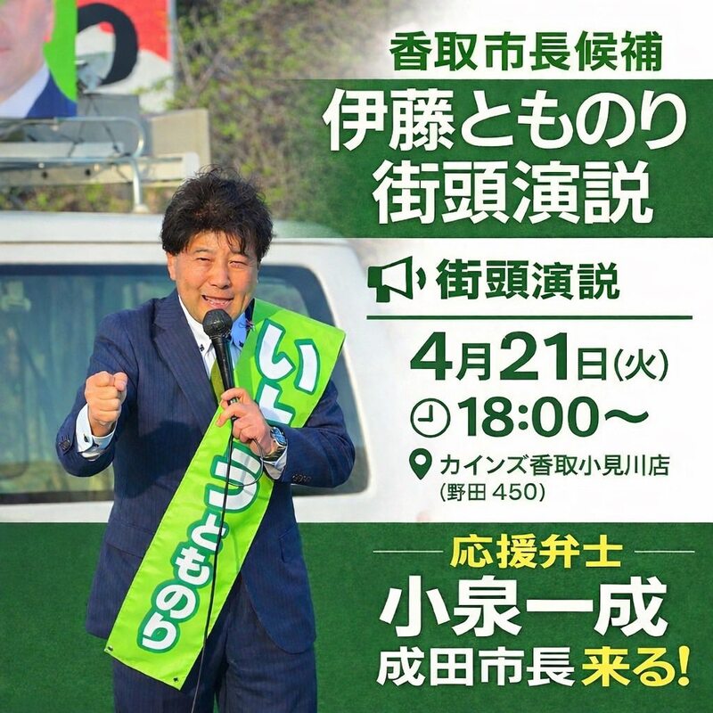 いとうとものり候補の街頭演説会でごあいさつ ザ・グレート・サスケ元岩手県議会議員にもお越しいただき、熱い応援演説 最後には多古町議会佐藤利治議員の気合が入ったごあいさつをいただきました 国・県・市でまとまるとともに、他地域との連携もしながら香取市政を着実に進めていくことが重要です