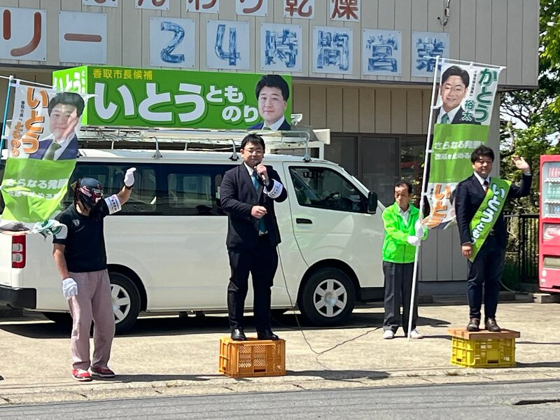 小見川のベイシア・カインズさん前でいとうとものり候補の街頭演説小泉成田市長と木内神栖市長、香取...
