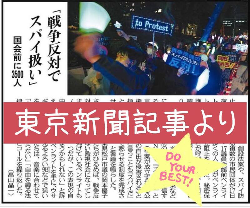 ◆東京新聞「戦争反対の声も上げられなくなる」監視社会招くスパイ防止法と国家情報会議に反対 国会前ペンライト行動