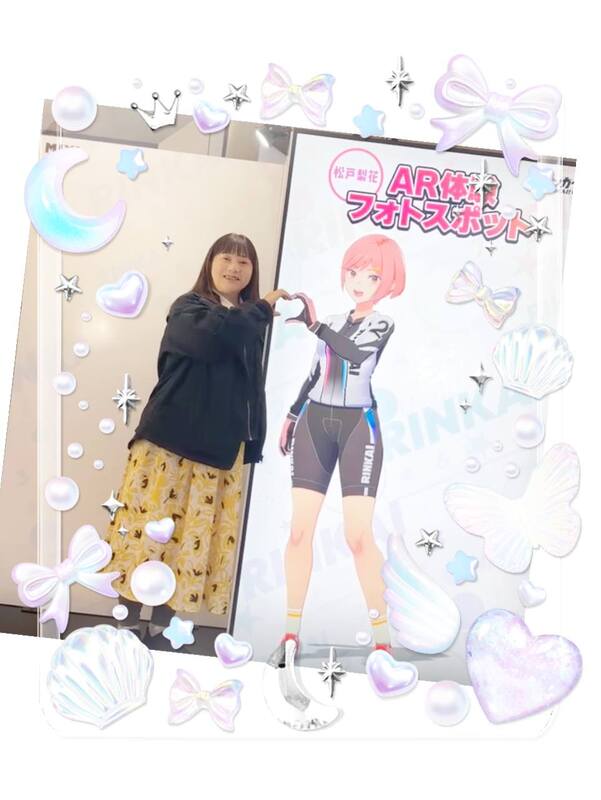 正面入口ブース横では、AR体験フォトスポットに挑戦しました。画面上の松戸梨花ちゃんと一緒に「ハートの形」を作ってきました。こうしたデジタル技術を活用したファンサービスは、新規層の獲得に不可欠な視点です。