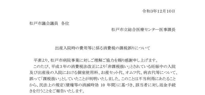 松戸市では、市立医療センター、市立病院において、本来は非課税の消費税を30年間誤って徴収していたと記者発表をいたしました。(2021年12月10日)