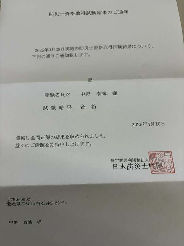 朝、事務所着いたら 日本防災士機構 から手紙が。