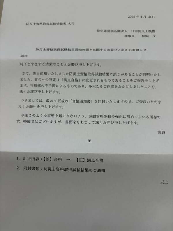 試験の結果の訂正で、