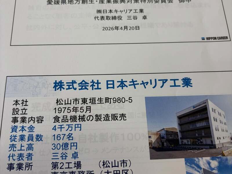 地方創生・産業振興対策特別委員会にて、本日は愛媛県経済労働部産業政策課から『県内ものづくり企業の取組について』説明いただき、その後『㈱⽇本キャリア工業(スゴ技企業)』の企業訪問をさせていただきました。