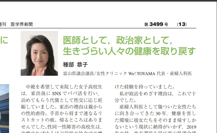 ホーム>政党・政治家>種部 恭子 (タネベ キョウコ)>週刊医学界新聞新年号に執筆しました。