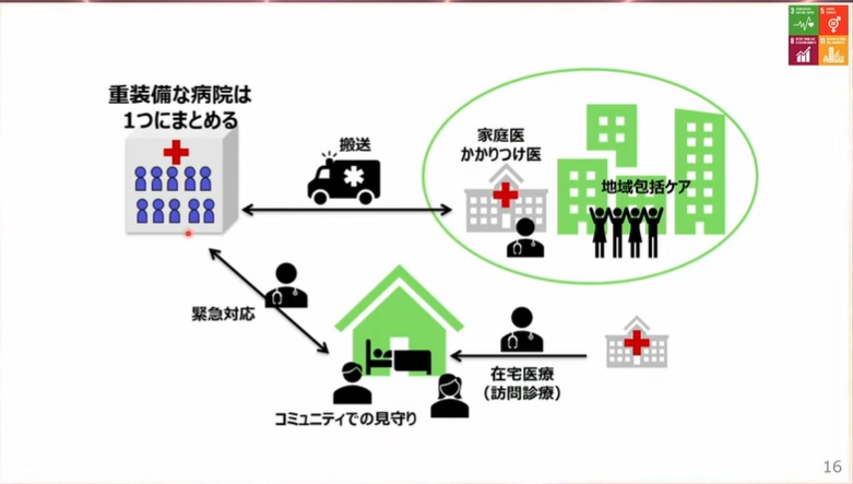 先に、在宅とか地域の中でアンカーを置いて、そして本当に必要な時は急性期医療機関に運ぶということを考えていただくとか、あるいは遠隔医療を推進するとかそういう安心できるような受け皿を作ってから 集約化を進めるべきではないかと思います。