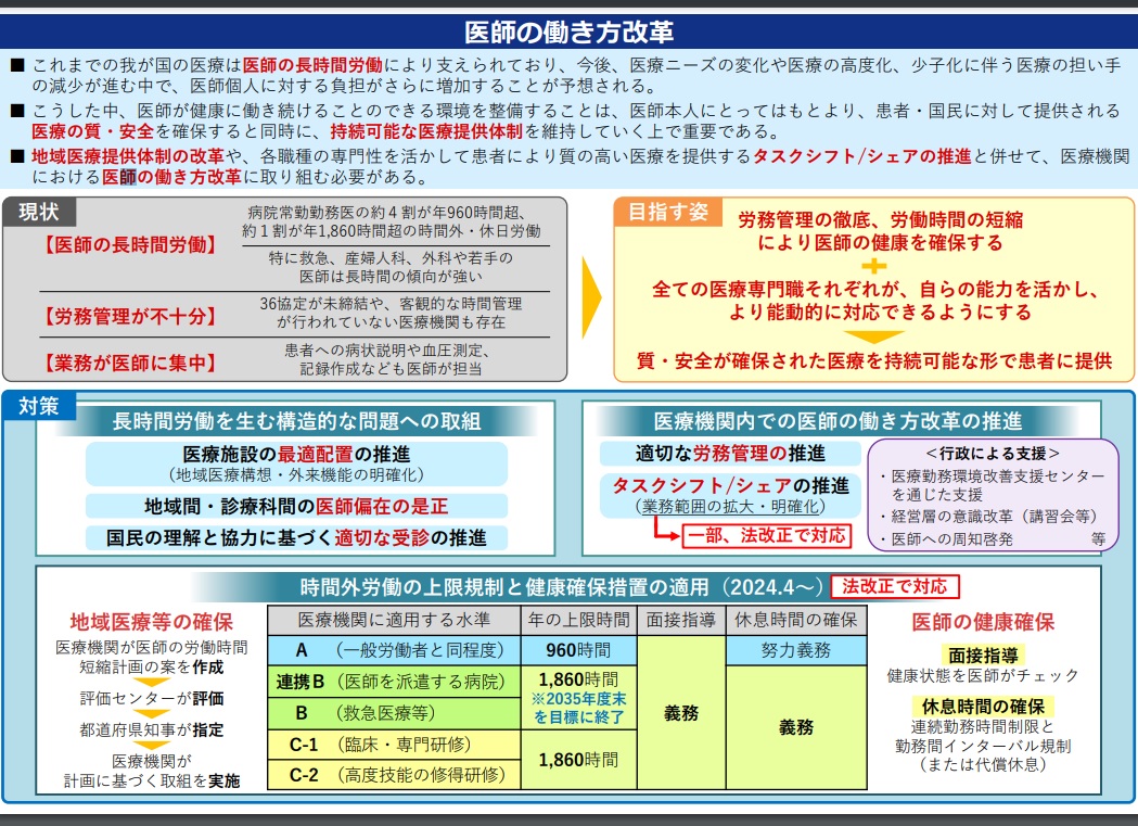 2024年4月から、医師にも「時間外労働の上限規制と健康確保措置の適用」が開始され、