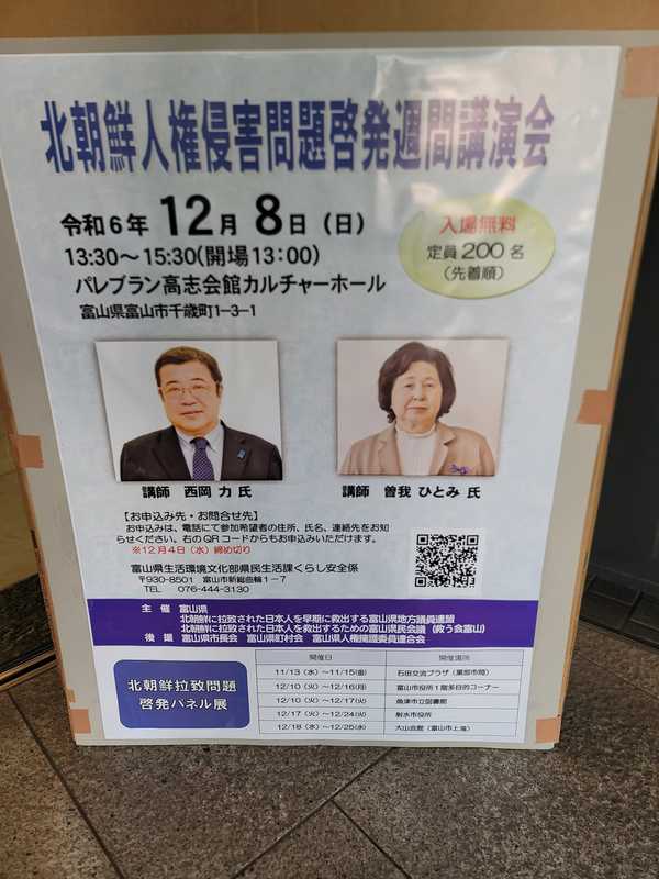 12月8日午後は北朝鮮人権侵害問題啓発の講演会を聴講。拉致被害当事者の曽我ひとみさんが初めて富山に来県され、拉致被害の実態をお話されました。拉致当日の様子から北朝鮮での過酷な生活、家族への想い等、心を打たれるエピソードばかり。拉致被害を風化させてはならない、と決意を新たにしました。